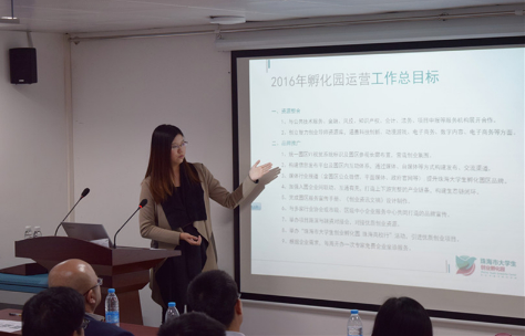 孵化园运营总监李洁舲以PPT介绍的形式为现场人员展示了珠海市大学生创业孵化园运营理念、服务配套等基础情况,并对2016年孵化园整体工作作出详细部署。